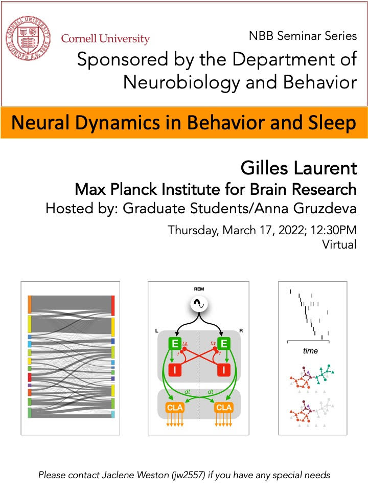 Cornell's Department of Neurobiology and Behavior is presenting Gilles Laurent from Max Planck Institute for Brain Research virtually on Thursday, March 17, 2022 at 12:30pm, hosted by Graduate Students/Anna Gruzdeva.