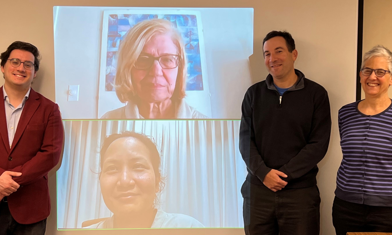 Pictured from left to right: Francesco Burroni, committee member Dr. Draga Zec (top image, remote), committee member Dr. Chutamanee Onsuwan of Thammasat University, Bangkok ,Thailand (lower image, remote), Committee Chair Dr. Sam Tilsen, and committee member Dr. Abby Cohn.