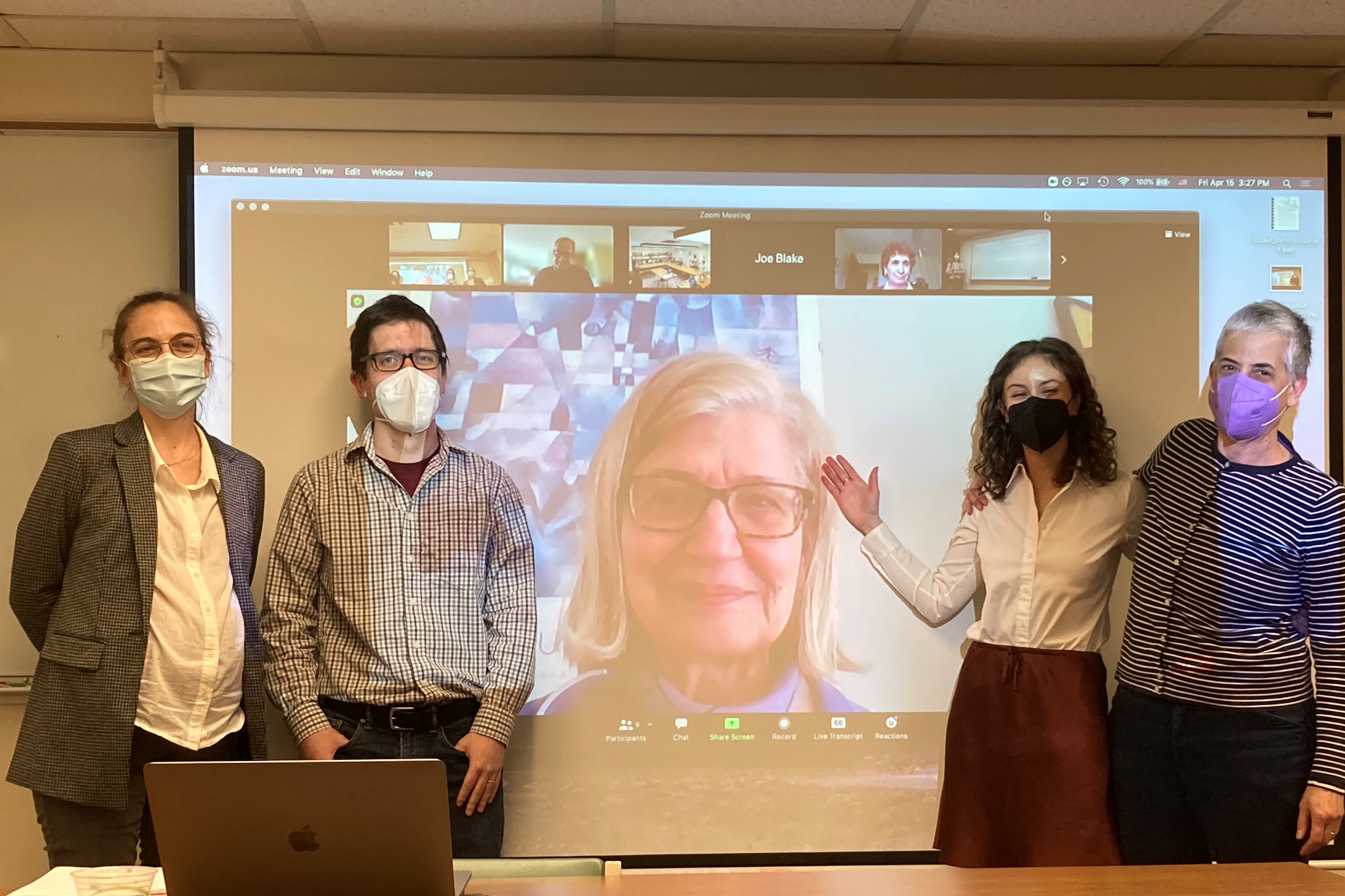Rachel is shown here with members of her Dissertation committee - from left Dr. Draga Zec, Rachel Vogel, Dr. Abigail Cohen (committee chair), and Dr. Sam Tilsen.