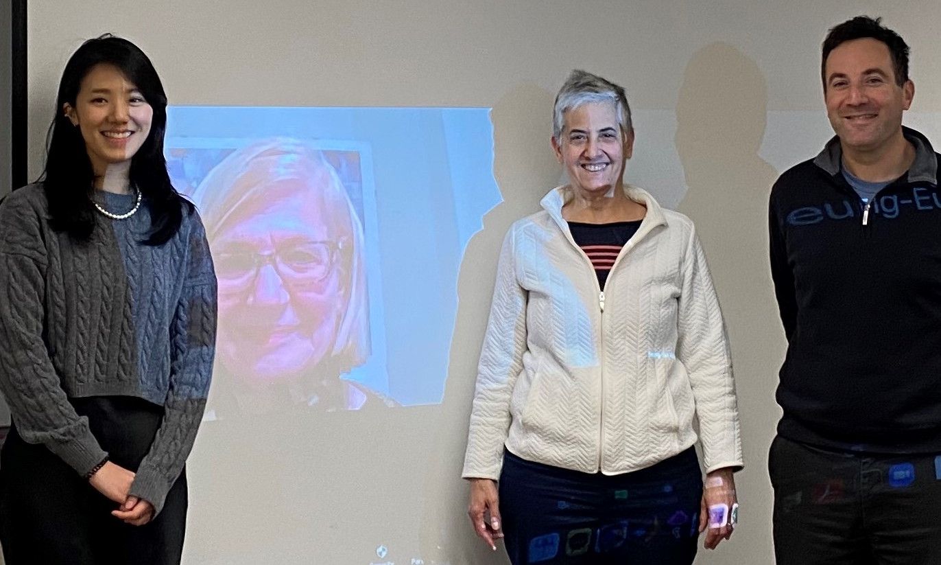 Shown in the picture, from left - Seung-Eun Kim, committee member Dr. Draga Zec (attending remotely), committee member Dr. Abby Cohn, and Committee Chair Dr. Sam Tilsen.